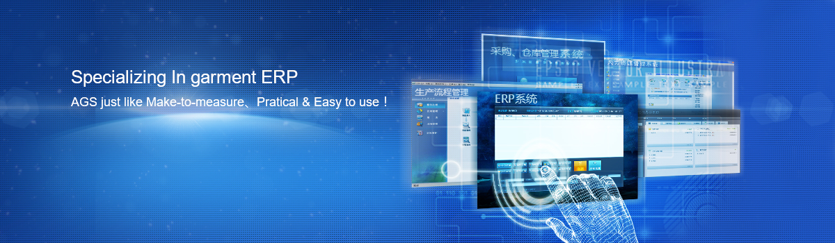 AGS-ERP specializes in apparel enterprise resources planning system. The system applys to HR, business, production, procurement, warehouse management and FI etc., including the entire process of enterprise. AGS-ERP's module can meet different kind of garment enterprises as module separated or combined, sorts of apparel OEM business, own-brand apparel manufacturers, apparel trade company. The service includes: software product, hardware interfaces, implementation services, customer development (redevelopment) and other integrated programmes etc.