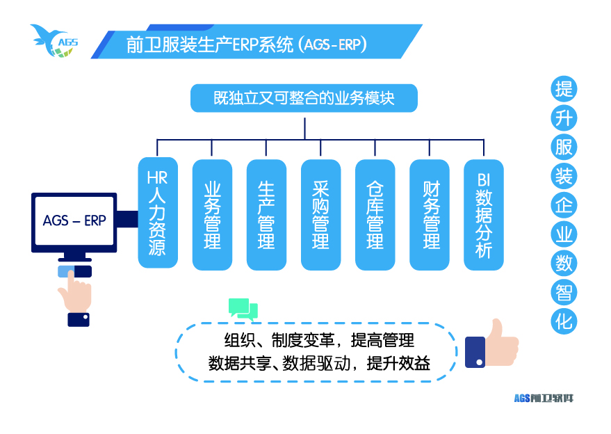 前衛(wèi)服裝 ERP 系統(tǒng)是專業(yè)的服裝企業(yè)資源計劃(ERP)系統(tǒng),該系統(tǒng)適用于服裝企業(yè)的人事、業(yè)務(wù)、生產(chǎn)、采購、倉庫及財務(wù)的全流程管理;集成車間MES系統(tǒng),倉庫WMS系統(tǒng),可雙向?qū)?/span>IE管理軟件(GSD)、吊掛系統(tǒng)、后道分揀系統(tǒng)、專業(yè)財務(wù)軟件等,數(shù)據(jù)驅(qū)動生產(chǎn),賦能服裝生產(chǎn)企業(yè)建立供應(yīng)鏈與生產(chǎn)協(xié)同。提高企業(yè)生產(chǎn)運營效率,助力提升企業(yè)的精益化生產(chǎn)能力,加快企業(yè)向信息化、數(shù)字化、智能化創(chuàng)新進一步深入發(fā)展。